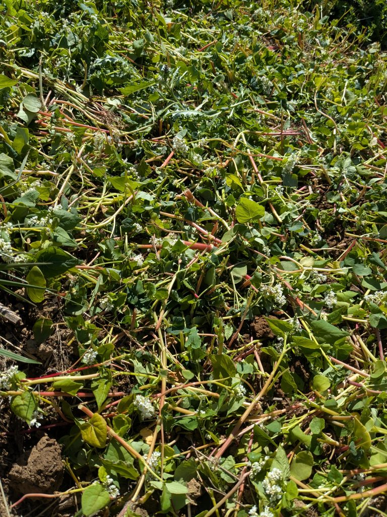 A bunch of dead plants. How exciting. Real National Geographic stuff there, eh? But to me, this is gorgeous. This is the first-ever buckwheat for the farm, grown and cut and killed for mulch on a bed that will host either garlic or potatoes next. It’s not my favorite cover crop, but it has advantages, such as quickly maturing flowers that feed pollinators in the summer. I’ll keep working on it as a cover crop option, but for a first effort, I’m really happy with the biomass and nectar it added to the system, with very little input of work. Win win.